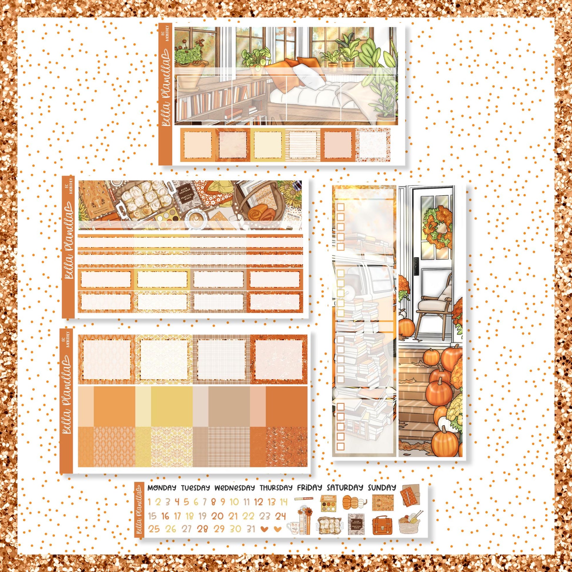5 Page Undated Monthly Sticker kit with a Deco/Functional sidebar option and separate Days of the Week (for a Sun-Sat or a Mon-Sun start), numbers & deco.