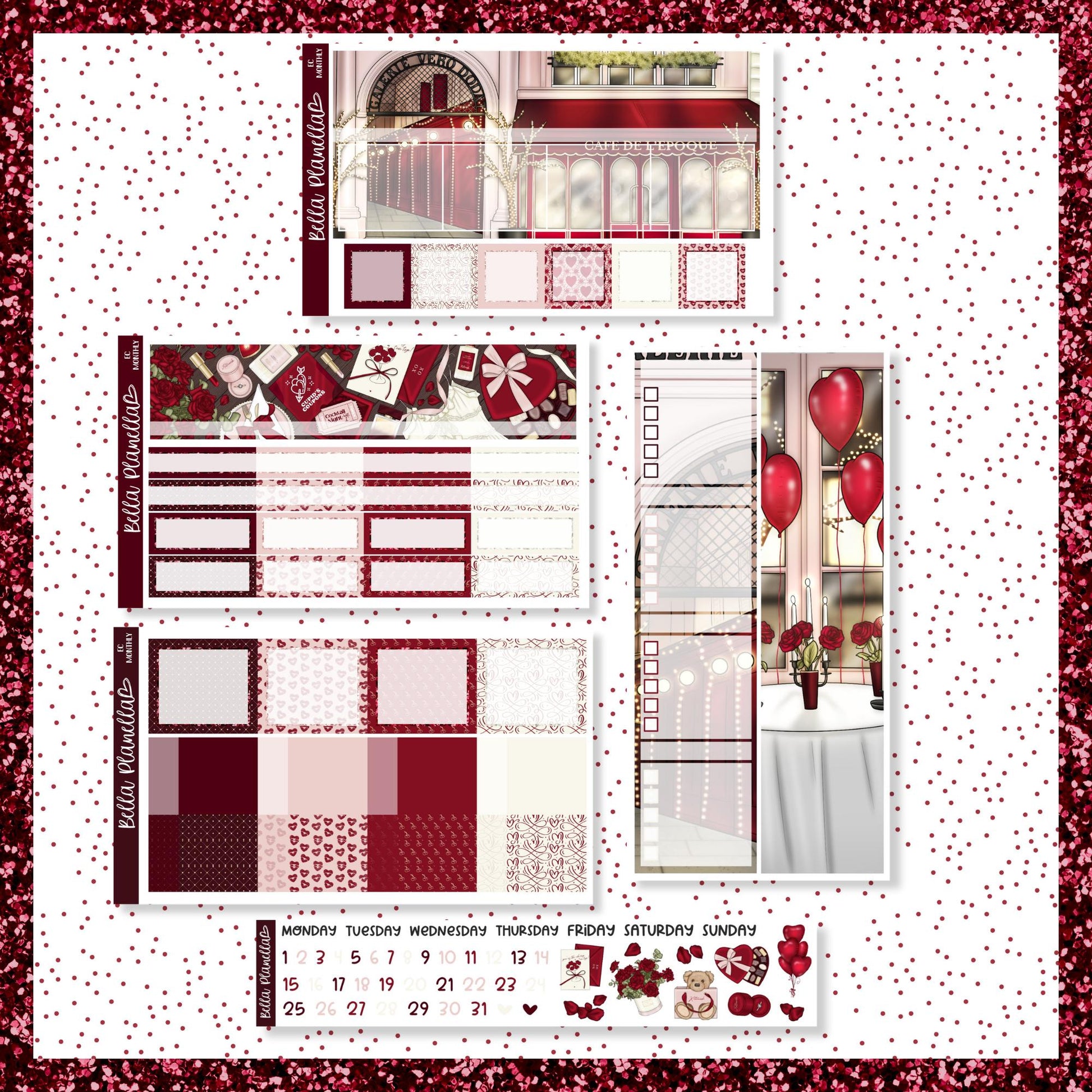 5 Page Undated Monthly Sticker kit with a Deco/Functional sidebar option and separate Days of the Week (for a Sun-Sat or a Mon-Sun start), numbers & deco.